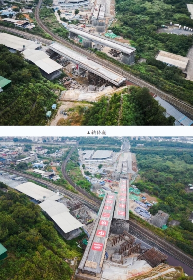當天7時04分,轉體橋梁開始轉體,經過44分鐘施工,成功完成高空“二人轉”,為下一步順利實現通車運營奠定堅實基礎。轉體橋上跨既有漳龍線、龍東線及煤場專用線3條鐵路貨運營業線,距離營業線最近距離僅5.9米,施工難度大,危險系數高。