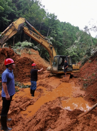 對搶險人員來說,最困難的不是清淤,而是5臺挖掘機、4臺拖車的加油問題,由于道路還未暢通,機械無法到達指定場所加油,當地又無加油車,如果無法加油,機械很快就將停工,救援人員已經做好一桶一桶“手動”拎汽油的準備。為解決加油問題,市政集團黨員代表與巖前鎮政府多次溝通,共同協調從廣東廣福鎮安排加油車到達受災點為機械進行加油,解決了現場機械供能問題。