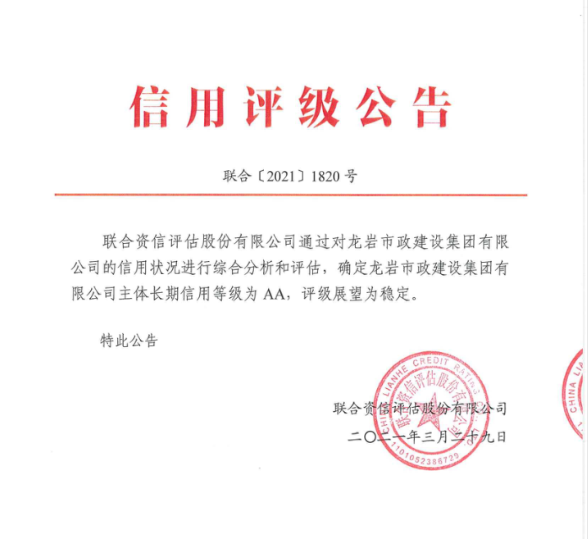 2021年3月29日,經國內權威評級機構聯合資信評估有限公司評級專家集體分析、研究、決議,一致通過給予龍巖市政建設集團有限公司AA主體信用評級,評級展望穩定。